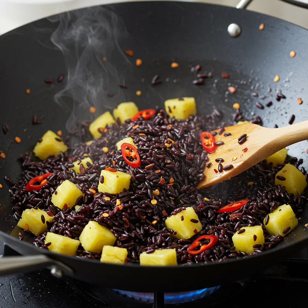 Add Rice, Pineapple & Chilli. Add chilled black rice, diced pineapple, and sliced red chili. Stir-fry for 2 minutes, breaking up clumps.